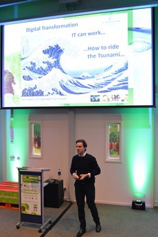 Les nouvelles technologies frappent la société et le secteur comme un tsunami. Ce n'est pas pour rien que le thème du forum était « Tsunami technologique ». « Ce thème m'a fait penser à ce tableau », commença Tom. Il se référait à un tableau ancien réalisé par l'artiste japonais Hokusai. Il dépeint une vague énorme. En arrière-plan, les contours du Mont Fuji sont visibles. Entre les vagues déchaînées, quelques bateaux flottent. Il y a là des pêcheurs qui essaient de faire face aux vagues. « J'aimerais utiliser ceci comme une métaphore de la situation dans laquelle nous nous trouvons. Tout comme ces pêcheurs, nous sommes confrontés à un énorme défi. »