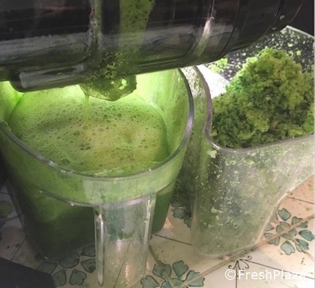 « Fondamentalement, une centrifugeuse est une sorte de râpe qui tourne rapidement (3 000/10 000 tours par minute) pour séparer la partie solide de la partie liquide à travers un écran perforé. Le jus est presque entièrement exempt de la fraction fibreuse, y compris la fraction soluble dans l'eau. De plus, en raison de l'attrition et donc de la chaleur générée (au-dessus de 50°C), nous avons une teneur plus faible en substances vitales, y compris la destruction absolue des enzymes. »