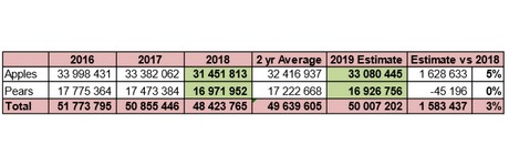 La vague de chaleur d’octobre 2018 a eu un impact négatif sur la variété Packham’s Triumph, alors que les arbres étaient en pleine floraison. Le volume des exportations est comparable à celui de la saison dernière : soit 5,62 millions de cartons. Les volumes de la variété de poire Williams Bon Chrétien devraient également diminuer de 7 %, en raison de la taille réduite des fruits.