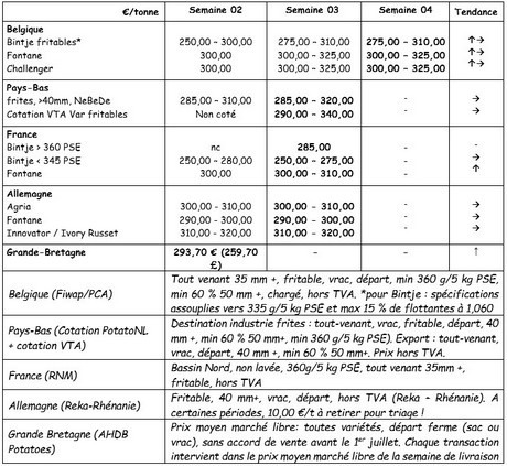 « qualité fritable » : max 15 % de flottantes à 1060 g/l et PSE min de 335 g/5 kg : 27,50 à 31,00 €/q en fonction de la qualité (PSE, cuisson,…),du calibre et de l’acheteur. Les prix du haut de la fourchette sont accordés pour de beaux lots réguliers et (très) bonne qualité, principalement pour les frites fraîches.