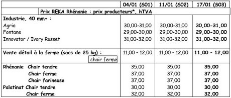 Sur le marché du frais (Rhénanie), au 18 janvier, prix inchangés pour les chairs fermes à 37,00 €/q pour du sortie stockage caisses - frigo, et à 35,00 €/q pour du sortie stockage caisses – frigo pour les chairs tendres. Pour les chairs fermes en vente à la ferme (Rhénanie) les prix variaient entre 11,00 et 12,00 € par sac de 25 kg (inchangé).