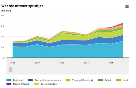 De tous les légumes d'hiver néerlandais, un plus grand nombre de choux de Bruxelles a été exporté ces dernières années. La valeur des exportations de ce légume est passée de 32 millions EUR en 2008 à 66 millions EUR en 2017.