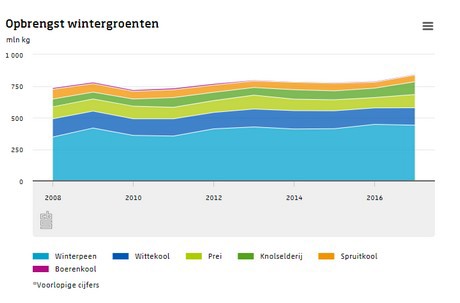 Aux Pays-Bas, en 2017, 847 millions de kg de légumes d'hiver ont été récoltés. Avec un rendement de 444 millions de kg, la carotte est le légume d'hiver le plus récolté. Ce légume-racine est suivi du chou blanc (138 millions kg) et du poireau (104 millions kg).