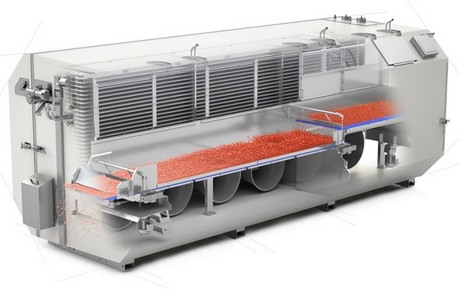 « Grâce à la vitesse réglable des ventilateurs, l'OctoFrost crée un flux d'air optimal dans chaque zone de congélation, ce qui permet une congélation douce mais rapide de la croûte. La croûte superficielle emprisonne l'humidité à l'intérieur et les baies conservent ainsi leur pulpe pleine et juteuse », poursuit M. Plotean. « Comme le montre la vidéo que nous avons diffusée, vous pouvez voir à quel point l'apparence et la texture naturelles des myrtilles IQF sont bien préservées pendant le processus de congélation. L'utilisation du tunnel de congélation OctoFrost IQF est la méthode optimale pour produire des myrtilles IQF de grande qualité. Notre tunnel de congélation a un design innovant qui offre quatre avantages principaux : sécurité alimentaire, aspect naturel, rendement élevé et efficacité énergétique », explique Plotean.