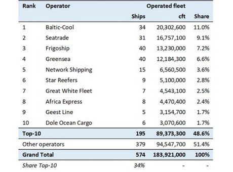 Malgré une flotte relativement petite de 574 navires d'une capacité de 183,9 millions de pieds cubes, la flotte frigorifique classique est plutôt fragmentée. Les 15 plus grands transporteurs exploitent 56 % de la flotte en termes de capacité.
