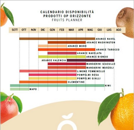 Quant à la campagne des agrumes, Op Orizzonte travaille avec les coopératives Giovinazzo et San Bartolo, qui commercialisent des produits comme les oranges (Navel, Tarocco, Washington, Moro, Sanguinello), les mandarines, les clémentines et les citrons mais aussi les grenades et les pêches.