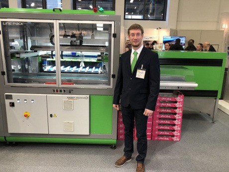 Axel Habeillon montre le tout nouveau Line Pack, qui dispose les pommes dans les colis.