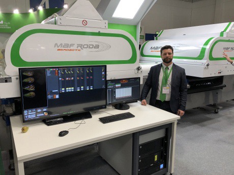 L'équipe de MAF RODA a présenté trois nouvelles machines: Le Line Pack et le Fast Pack pour la disposition des pommes, et une calibreuse pour les poires longues. Cette calibreuse s'appelle le Bi-Axone. Cette machine innovante permet de tourner les poires délicatement sans les endommager.