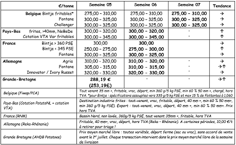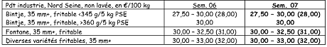 - Bintje : marché soutenu : « qualité fritable » : max 15 % de flottantes à 1060 g/l et PSE min de 335 g/5 kg : 27,50 à 31,00 €/q en fonction de la qualité (PSE, cuisson…), du calibre et de l’acheteur. Les prix du haut de la fourchette sont accordés pour les plus beaux lots et de très bonne qualité, principalement pour les frites fraîches.