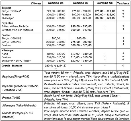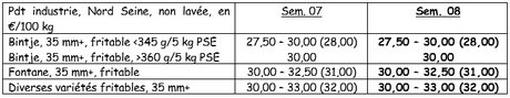 Bintje : « qualité fritable » : max 15 % de flottantes à 1060 g/l et PSE min de 335 g/5 kg : 27,50 à 31,00 €/q en fonction de la qualité (PSE, cuisson…), du calibre et de l’acheteur. Les prix du haut de la fourchette sont accordés pour les plus beaux lots et de très bonne qualité, principalement pour les frites fraîches.