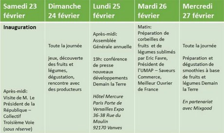 Afin de toujours plus sensibiliser le grand public à cette démarche, Demain la Terre renforce sa présence au Salon de l’Agriculture. C’est cette fois sur le pavillon 2.2 dédié aux cultures végétales que Demain la Terre exposera sur un stand de 25 m², le double de celui des années précédentes. Ce stand permettra l’exposition des produits des agriculteurs membres par leur mise en valeur et les déclinaisons que l’on peut en faire (préparations, corbeilles, smoothies…).