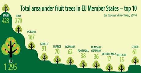 En 2017, l'UE comptait près de 1,3 million d'hectares d'arbres fruitiers. Un peu plus du tiers de ce chiffre correspond aux pommiers (473 500 ha, 37 %) et un cinquième aux orangers (255 500 ha, 20 %). Le reste était réparti entre les pêches (190 500 ha, 15 %), les petits agrumes comme les mandarines satsumas et les clémentines (139 600 ha, 11 %), les poires (100 400 ha, 8 %), les abricotiers (75 700 ha, 6 %) et les citronniers (60 100 ha, 5 %). La superficie consacrée aux arbres fruitiers représentait environ 1 % de la superficie agricole utilisée (173 millions d'hectares en 2016), selon les dernières données d'Eurostat.