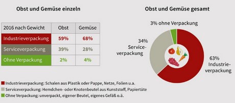 En Allemagne, de plus en plus de déchets d'emballages s'accumulent. L'une des raisons est que de plus en plus de fruits et légumes frais sont vendus préemballés. Le chiffre s'élève maintenant à 63 %. C'est le résultat d'une étude réalisée par la GVM Gesellschaft für Verpackungsmarktforschung pour le compte de la NABU. Pour la première fois en 2015, GVM a mis à jour les données collectées sur le volume de conditionnement des fruits et légumes.