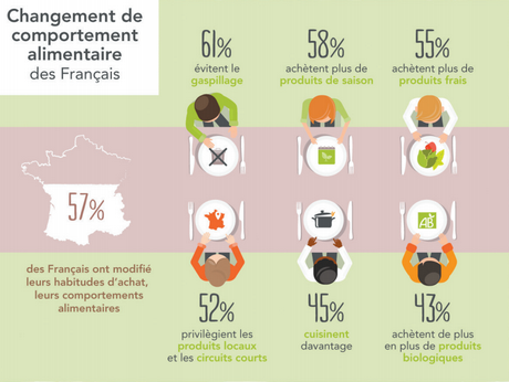 D'autres résultats intéressants montrent que 57 % des français ont changé leurs comportements alimentaires. 43 % achètent de plus en plus de produits biologiques. 52 % privilégient les produits locaux et les circuits courts, et 58 % achètent plus de produits de saison qu’avant.