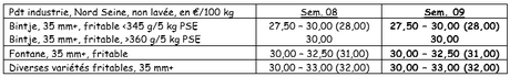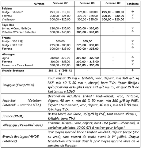 Bintje : « qualité fritable » : max 15 % de flottantes à 1060 g/l et PSE min de 335 g/5 kg : 27,50 à 30,00 €/q en fonction de la qualité (PSE, cuisson…), du calibre et de l’acheteur. Marché stable. Les prix du haut de la fourchette sont accordés pour les plus beaux lots et de très bonne qualité, principalement pour les frites fraîches.