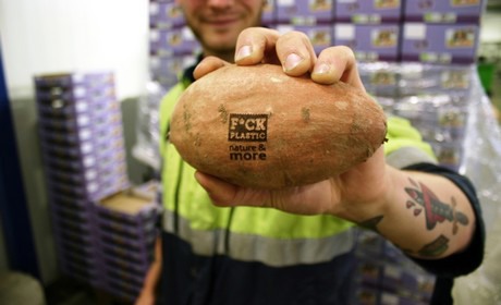 Cela fait déjà des années qu’Eosta investit dans le développement de solutions alternatives au plastique. Parmi elles, le « Natural Branding », ce fameux système de marquage naturel « sans contact » approuvée par le SKAL, organisme certificateur hollandais biologique de l’UE et que l’Account manager présente : « c’est une technique réalisée grâce à un laser très fin, qui va marquer uniquement la première couche épidermique du produit. Cette technologie nous permet de graver une marque, un logo, un numéro de lot, un slogan… ou ce que l’on veut. Il suffit d’informer la machine du motif à effectuer, les produits passent sur un tapis puis sous le laser et ressortent gravés. Aucune encre n’est utilisée, et cela n’affecte en rien les qualités organoleptiques ou visuelles du produit une fois pelé. La durée de conservation du fruit ou légume n’est pas non plus impactée. En plus de ne produire aucun déchet, l’énergie nécessaire pour un marquage est inférieure à 1% de l’énergie nécessaire pour une étiquette. Il faut savoir que pour une seule ligne de produit et un seul client, nous économisons plus de 750 000 unités plastiques, ce qui représente des tonnes de plastique. Mesuré en émissions de CO2, c’est l’équivalent d’1,3 tour du monde en voiture ! ».
