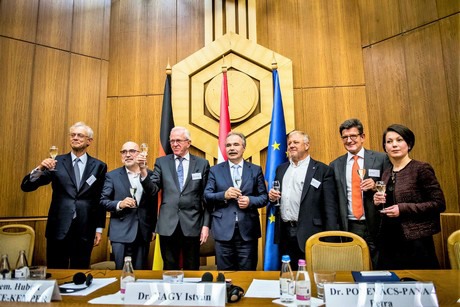 Les partenaires tous réunis : Hans-Jürgen Best (ville d'Essen), Thomas Schlich (Landgard Obst & Gemüse GmbH & Co. KG), Prof. em. Hubert Schulte-Kemper (CEO FAKT.AG), Dr. István Nagy (ministre de l'agriculture hongrois), Mihaly Varga (KÉSZ Holding Zrt.), Zsolt Jamniczky (E.ON)