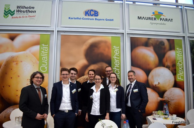 Le KCB au Fruit Logistica 2019, représenté sur le stand commun de Maurer-Parat (de gauche à droite) : Karsten Krisch (Maurer-Parat), Johannes Rohbeck (Wilhelm Weuthen GmbH & Co. KG), Tom Faessen (Wilhelm Weuthen), Richard Grob (KCB), Larissa Hafner (Wilhelm Weuthen), Stefan Claser (Wilhelm Weuthen), Christina Schröder (Wilhelm Weuthen) et Ludwig Hartmann (Maurer Parat).