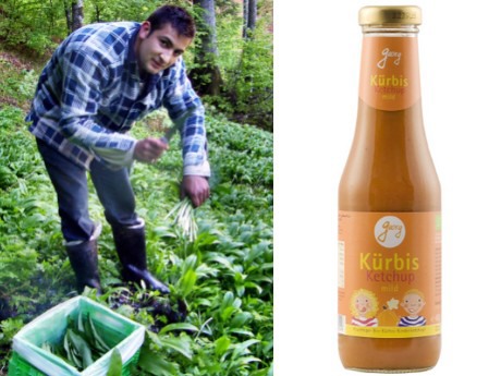 A gauche : Récolte de l'ail des ours dans la hêtraie, à droite : Le ketchup de citrouille, une spécialité qui a fait ses preuves dans la gamme existante.