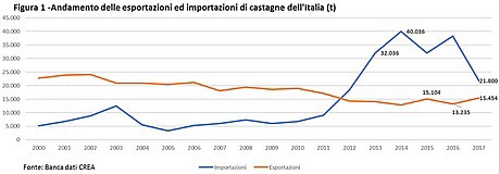 En 2018, la principale destination des châtaignes italiennes était la France avec un peu plus de 3 000 tonnes, suivie par l'Allemagne avec environ 2 800 tonnes, la Suisse avec 2 200 tonnes et l'Autriche avec 1 500 tonnes.