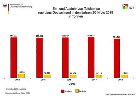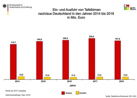 Les taux d'importation des poires allemandes sont restés pratiquement inchangés de 2014 à 2018 inclus. Ce n'est qu'en 2018 qu'une légère baisse d'environ 5 000 tonnes a été enregistrée. Les prix des poires à l'importation étaient légèrement instables, comme le montre un rapport de l'Agence fédérale de l'agriculture et de l'alimentation.