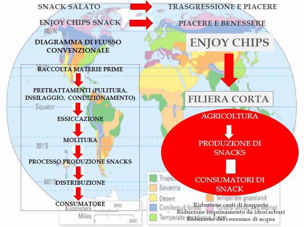 Aucune farine, aucun arôme ou autre composant chimique industriel n'est utilisé pendant la transformation. Après une étude précise, 20 gr de mélanges avec moins de 100 calories ont été mis au point, obtenant ainsi une collation idéale pour le bien-être psychophysique. Le résultat est une collation savoureuse riche en fibres et colorée naturellement avec seulement 6 % de graisses, cuite au four et donc avec des niveaux d'acrylamide inférieurs à la limite recommandée et avec une faible teneur en sel.