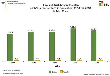 La part de marché des tomates importées sur le marché allemand est restée pratiquement la même ces dernières années. Il n'y a pas eu de hauts ou de bas significatifs, bien qu'au cours des trois dernières années, il y ait eu une baisse constante d'environ 10 000 tonnes par an. Au cours des 5 dernières années, les quantités se sont toujours situées entre 720 000 et 760 000 tonnes. L'Agence fédérale pour l'agriculture et l'alimentation (BLE) en a fait état.