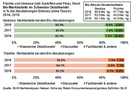 Entre 2016 et 2018, les ventes de produits biologiques ont augmenté dans le commerce des fruits et des légumes. Sur ce marché en croissance, le commerce de détail traditionnel, en particulier Coop et Migros, a atteint une part de marché de 82 % (légumes) et 85 % (fruits). Les magasins de discount, les détaillants et les autres canaux de vente n'ont pas été en mesure d'accroître leur part de marché entre 2016 et 2018. La Confédération suisse en a fait état dans son rapport mensuel.