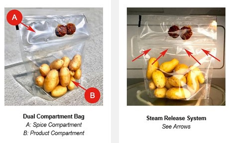 « Ce sac vous permet de cuisiner rapidement et facilement pour toute votre famille. De plus, les assaisonnements de pommes de terre et de puces à beurre sont stockés séparément dans un sac à double chambre. Par ailleurs, la bande de vapeur dans le sac offre une durée de conservation prolongée » déclare Hans Schur, PDG de Schur® Star Systems Inc.