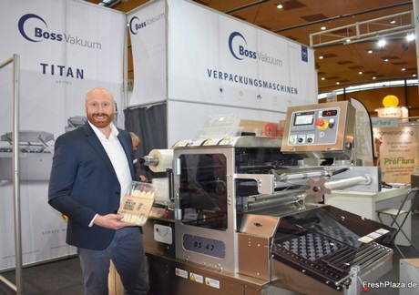 Lars Pahl au stand commun des deux sociétés Boss Vakuum et BS Verpackungen à l'ExpoSE de Karlsruhe, l'année dernière. Le système de scellage automatique BS 47 couvre l’ensemble du processus d’emballage et est déjà utilisé à divers endroits en Allemagne.