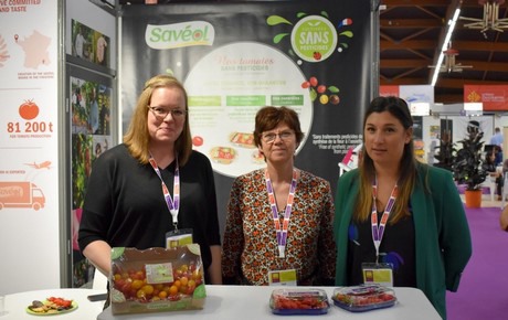 Claire Simon, Patricia Dinahet et Stéphanie Le Gall au MedFEL la semaine dernière. Outre les tomates de pleine terre, elles ont présenté la gamme de fraises et tomates cultivées sans pesticides