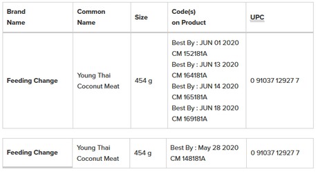 L'avis de rappel initial affiché le 14 avril pour la « noix de coco jeune thaïlandaise » sous la marque FeedingChange Canada ne concernait que les emballages dont le code de date était le 28 mai 2020, selon l'Agence canadienne d'inspection des aliments (ACIA).