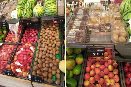 Toutefois, ce qui est commun aux deux régions, c'est que les fruits pré-coupés gagnent en popularité. C'est très pratique pour le client, parce que certains fruits comme l'ananas ne sont pas évidents à couper soi-même. Ainsi, quand il est déjà coupé, plus de gens s'y intéressent pour l'acheter. Les magasins chinois vont un peu plus loin et ont parfois quelqu'un qui coupe les fruits sur place. Ci-dessous figurent quelques photos où le même fruit est comparé dans des supermarchés aux Pays-Bas et en Chine.