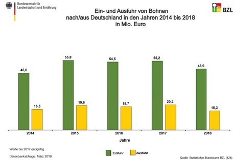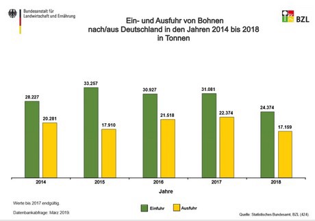 Les quantités annuelles de haricots importées et exportées présentent de grandes fluctuations. Ci-dessous : des graphiques de l'Agence fédérale de l'agriculture et de l'alimentation (BLE).