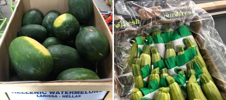 Un aperçu de l'assortiment saisonnier : les pastèques grecques et les légumes se vendent très rapidement.