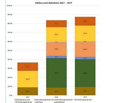 Les fraises sont plantées en Suisse sur 510 hectares (-0,3%) et les surfaces cultivées sont constantes. Afin de sécuriser l'approvisionnement intérieur, la zone protégée contre les intempéries a été augmentée. En 2019, 34,2 % (174,5 ha) de la superficie de fraises sont sous protection climatique.