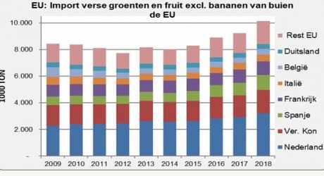 Pour les importations de fruits et légumes frais (à l'exclusion des bananes) en dehors de l'UE, les Pays-Bas sont principalement des ports d'importation pour les produits d'Afrique du Sud (48 % du total des importations de l'UE en provenance de ce pays), du Costa Rica (34 %), du Brésil (48 %), du Pérou (52 %), du Chili (47 %) et de l’Égypte (38 %). Les produits marocains arrivent principalement dans l'UE à travers l'Espagne et la France. Le produit turc est (initialement) surtout envoyé en Roumanie, en Bulgarie et en Autriche et pour finir, le produit néo-zélandais arrive traditionnellement dans l'UE en transitant par la Belgique.