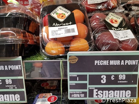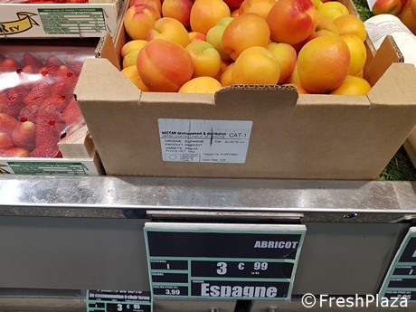 Il y avait un certain nombre d'abricots principalement d'Espagne et de France. Les abricots espagnols sont de bonne qualité et ont un bon aspect ; ils sont vendus en vrac à 3,99 € / kg. Mais également des barquettes de 6 fruits de la variété Colorado de 400 grammes, vendues à 3,99 € / barquette.