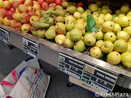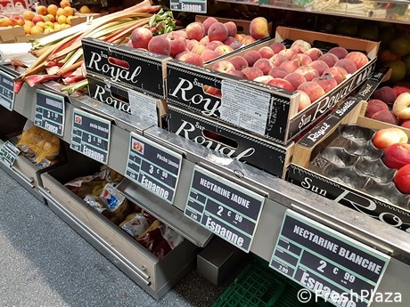Concernant les poires, la Conference (Pays-Bas), la Williams (Argentine) et la Rocha (Portugal) sont vendues respectivement au prix de 2,45 €, 2,95 € et 2,75 € / kg. Les fraises d'Espagne quant à elles sont vendues 4,50 € / kg. Les pêches de qualité B conditionnées dans des barquettes de 400 grammes (4 fruits) sont vendues 3,99 € / kg. Les pommes Pink Lady de France sont à 2,99 € / kg.
