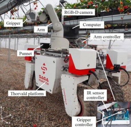 Des scientifiques de l'Université norvégienne des Sciences de la vie, en collaboration avec le Département d'informatique de l'Université du Minnesota, ont mis au point et évalué un robot pour la récolte des fraises cultivées sur table dans des polytunnels. Le robot se compose d'une nouvelle pince articulée sur un bras industriel qui, lui-même, est monté sur une base mobile avec une caméra RGB-D. La nouvelle pince à câble permet d'ouvrir les doigts pour « avaler » les fruits. Étant donné qu'elle est conçue pour cibler le fruit et non la tige, elle ne requiert que l'emplacement du fruit pour la cueillette. La pince est résistante aux erreurs de localisation introduites par le module de vision et possède un récipient interne qui est utilisé pour la collecte des baies pendant la cueillette.