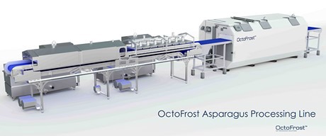 Pour assurer le meilleur produit final possible et une rentabilité optimale, il faut d'abord utiliser le bon équipement pour transformer les produits. OctoFrost possède la seule ligne de transformation horizontale d'asperges IQF sur le marché : « La ligne complète de transformation d'asperges OctoFrost™ se compose d'un blanchisseur IF, d'un refroidisseur IF et d'un tunnel de congélation IQF. Comme la ligne est complètement horizontale, les asperges demeurent statiques pendant tout le processus et ne tombent pas d'un niveau à un autre. Les asperges sortent du congélateur triées comme elles ont été déposées sur le tapis blanchisseur. Les pointes des asperges sont donc à l'abri des dommages et aucune perte de valeur pour le produit. Nous disposons actuellement de la seule ligne de transformation horizontale pour les asperges IQF sur le marché. Les négociants nous ont affirmé être prêts à payer 5 à 30 % de plus pour des produits IQF de première qualité », explique Hultin.