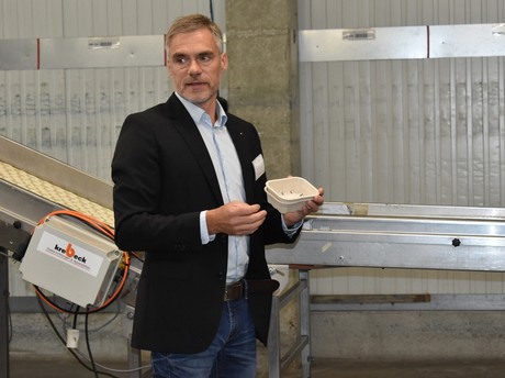 Jörg Lübbehüsen, directeur général, présente des barquettes en pâte de bois durables, une autre solution d'emballage qui a reçu un bon accueil.