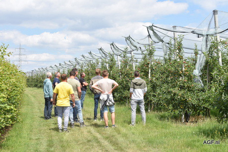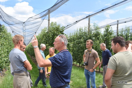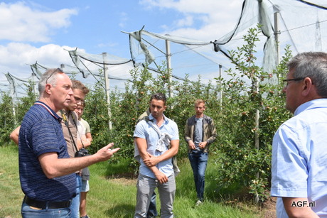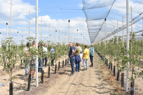 « Nous sommes plus élevés ici que dans les environs, ce qui est très avantageux pour le gel. L'eau, par contre, reste un défi car elle est très rare dans cette région », explique Pieter Aalbers pendant la visite. Hermens Fruitsystems est une entreprise de culture familiale dont la troisième génération a pris les rennes. En plus de la culture fruitière, Hermens importe des systèmes italiens de défense contre la grêle et d'autres aides à la culture. L'entreprise fruitière se compose de 18 hectares de pommes et de poires dont 6 hectares de Conference, 5 hectares d'Elstar, 1 hectare de Junami et 3 hectares de Magic Star seront bientôt plantés. Le projet est d'étendre la zone de Magic Star, ce qui finira par se faire au détriment de la Junami et de la Conférence.