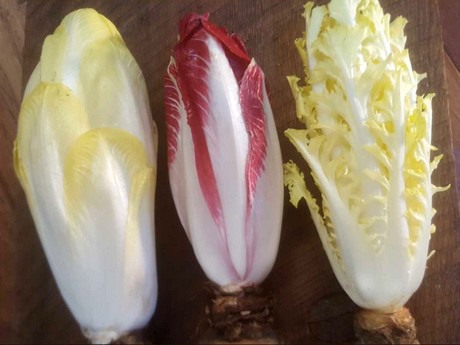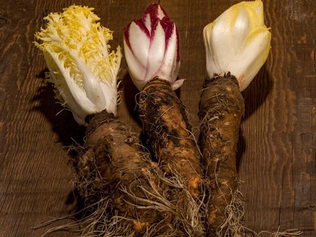 Les endives belges sont cultivées de manière très particulière pour obtenir la couleur voulue ainsi qu'un approvisionnement permanent. La méthode a été largement utilisée en Europe et California Endive Farms suit un système similaire. Les graines sont semées dans les champs à la fin du printemps et au début de l'été. Une fois qu'elles ont poussé pendant plusieurs mois, les fanes sont coupées à l'automne et les racines sont récoltées et stockées à une température de 28 degrés. Elles sont « exposées à la neige et au vent », comme l'explique Reed. « Elles doivent recevoir environ 220 heures de froid, pour avoir une racine saine et ferme. » Le froid entraîne la dormance de la racine jusqu'à ce qu'il soit temps de l'exposer à des conditions printanières où elle effectuera une seconde croissance pour fournir l'endive, selon les exigences de la production.
