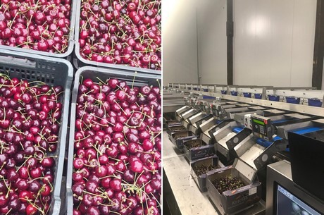 Gauche : Tri des cerises à la main - Droite : Le calibre des fruits ainsi que le poids sont déterminants pour la qualité des produits. Cela se fait par tri photo-optique.