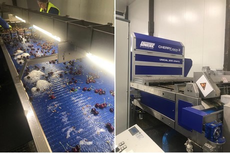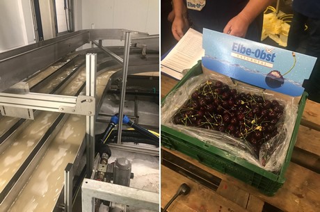 A gauche : Technique de convoyage ultramoderne disponible dans le hall de production d'Elbe-Obst - à droite : Cerises fraîches de l'Altes Land