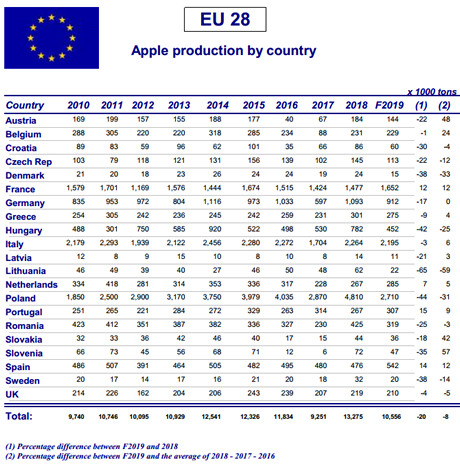 La Pologne est le géant européen de la pomme mais accusera néanmoins une baisse de 44 %. Le rendement devrait être de 2 710 000 tonnes, contre 4 810 000 tonnes l'année dernière. En Italie, les rendements ne sont que de 3 % inférieurs à ceux de l’année dernière. Selon la WAPA, ce pays récoltera 2 195 000 tonnes de pommes. La France occupe la troisième place avec 12 % de plus que l'année dernière - 1 652 000 tonnes.