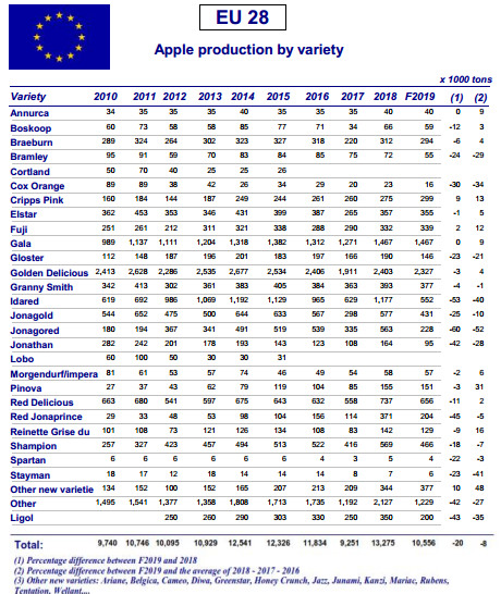 La Golden Delicious reste, de loin, la plus grande variété de pommes d’Europe. Les prévisions annoncent pour cette année une récolte à hauteur de 2 327 000 tonnes (-3 %). Avec 1 467 000 tonnes, les estimations pour la Gala sont exactement les mêmes que celles de l’année dernière. La récolte européenne d'Elstar sera également à peu près équivalente à celle de l'année dernière, avec un volume de 355 000 tonnes attendu.