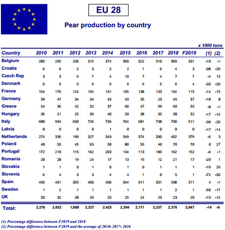 Avec 511 000 tonnes, la récolte de poires en Italie est bien inférieure à celle de l'année dernière, elle accuse une chute de 30 %. En termes de moyenne sur les trois saisons précédentes, le rendement est inférieur de 29 %. Aux Pays-Bas, la récolte de poires devrait être inférieure de 6 %, à 379 000 tonnes, mais toujours supérieur de 3 % à la moyenne des trois dernières années. La Belgique compte, elle, 10 % de poires en moins avec 331 000 tonnes par rapport à l'année dernière. Vient ensuite l'Espagne avec 311 000 tonnes, une hausse de 4 %.