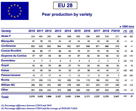 Pour la Conférence européenne les estimations tablent sur 8 % de moins que l'année dernière avec un volume de 910 000 tonnes. La faible estimation des poires italiennes permettra de disposer de 34 % de poires Abate Fetel en moins (211 000 tonnes), selon les estimations de la WAPA. Quant à la Williams BC c'est 230 000 tonnes en Europe.